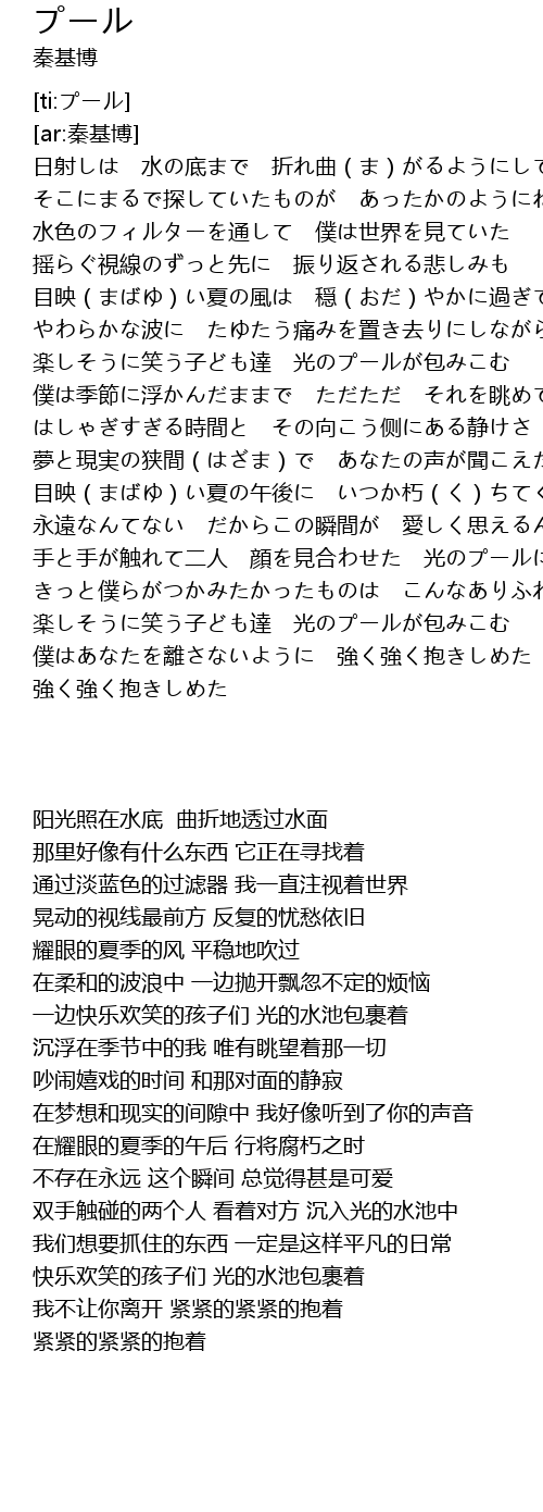 | [02:41.116] | 手と手が触れて二人 顔を見合わせた 光のプールに沈み迂む |