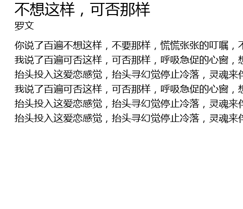 | 我说了百遍可否这样,可否那样,呼吸急促的心窗,想到漆黑中欣赏的每样。别要再次乱说没妄想,别要推搪讲一声请见谅。投入这一夜,浪漫也抽象,别太多这样那样。 | |