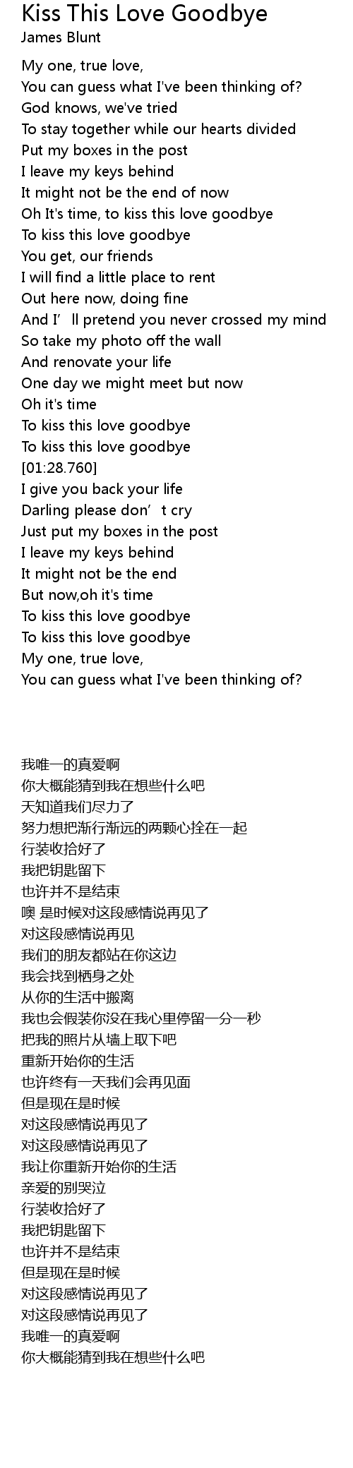 | [00:28.189] | Oh It's time, to kiss this love goodbye |