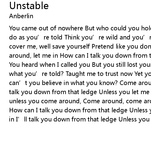 | You came out of nowhere But who could you hold wild horse unstable Do you still do as you' re told Think you' re wild and you' re free now Think you can cover me, well save yourself Pretend like you don' t do what you' re told Come around, let me in How can I talk you down from that ledge Unless you let me in? You heard when I called you But you still lost your way Are you able To do just what you' re told? Taught me to trust now Yet you have no faith in yourself Why can' t you believe in what you know? Come around darling Let me in How can I talk you down from that ledge Unless you let me in? How can I talk you down unless you come around, Come around, come around? Come around, darling Let me in How can I talk you down from that ledge Unless you let me in? Come around Let me in I' ll talk you down from that ledge Unless you let me in, lovely |