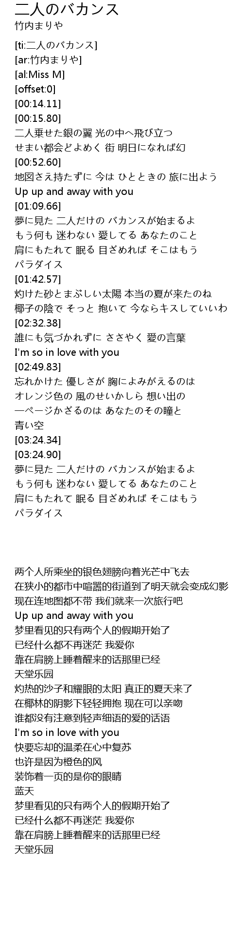 | [03:30.66] | 夢に見た 二人だけの バカンスが始まるよ |