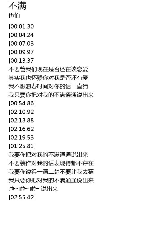 | [00:24.77][00:01.30] | 我要你把对我的不满通通说出来 |