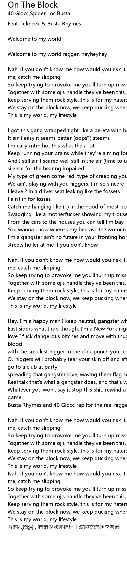 [01:42.30] Hey, I' m a happy man I keep neutral, gangster who I fuck with, mutual East siders what I rap though, I' m a New York nigger with infinite West Coast love I fuck dangerous bitches and move with thugs, rolling 60' s crip I room blood