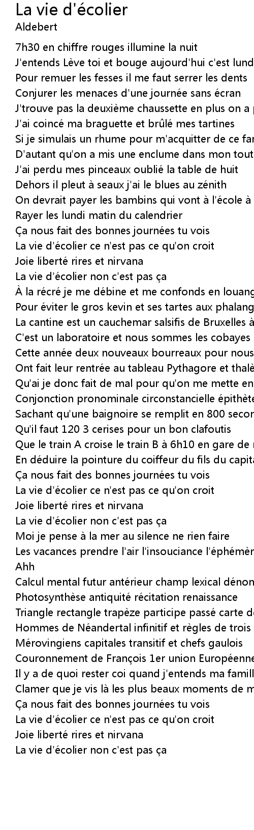 | [00:44.41] | La vie d'é colier ce n' est pas ce qu' on croit |