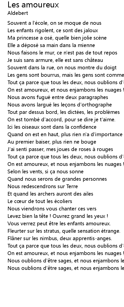 | [02:05.85] | On est amoureux, et nous enjambons les nuages ! |