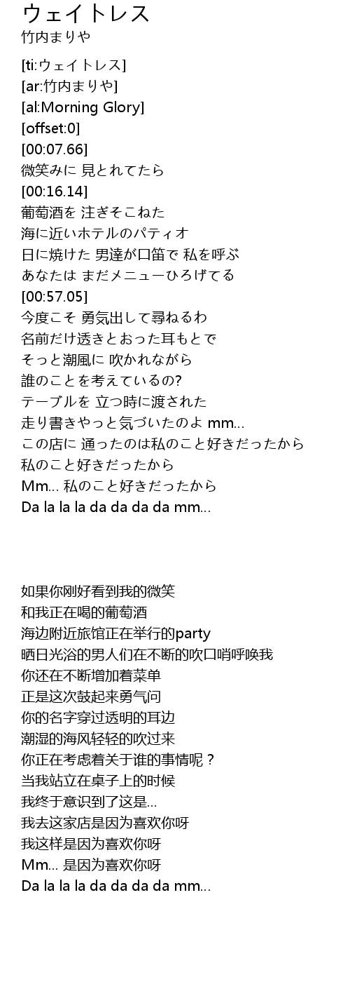 | [00:33.56] | 日に焼けた 男達が口笛で 私を呼ぶ |