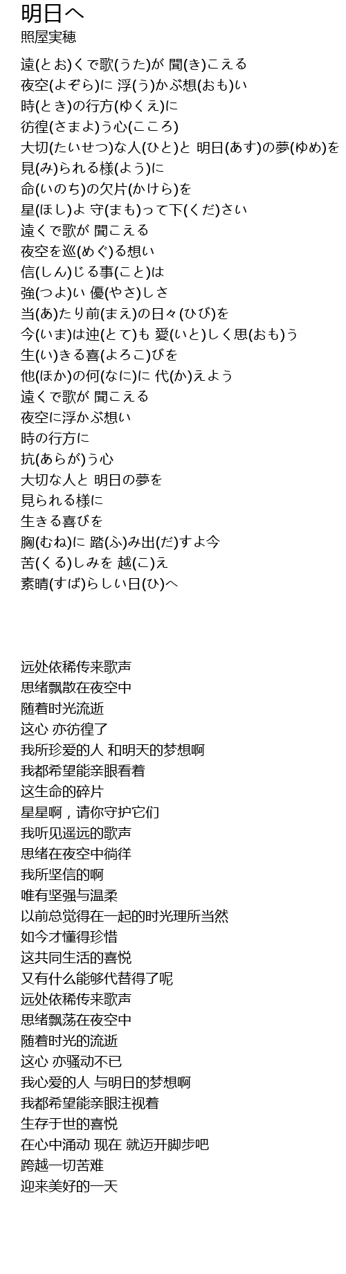 | [00:45.470] | 大切(たいせつ)な人(ひと)と 明日(あす)の夢(ゆめ)を |