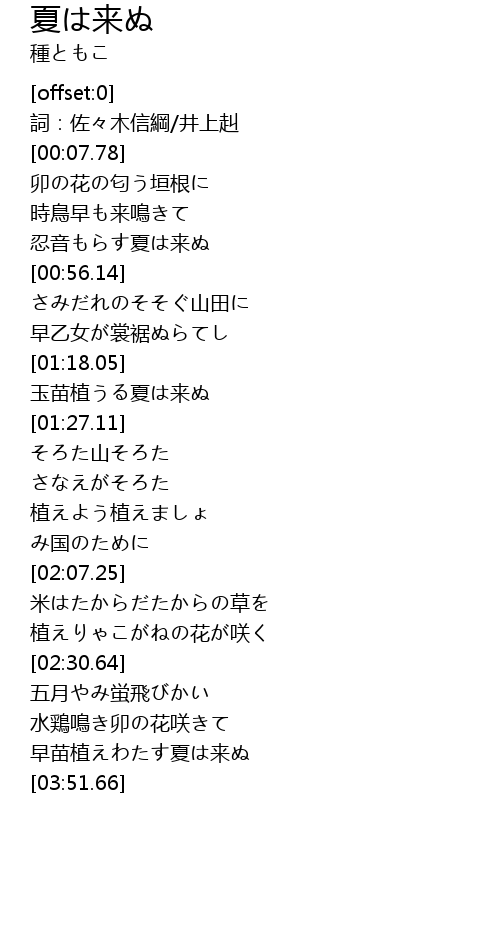 | [03:41.55] | 早苗植えわたす夏は来ぬ |