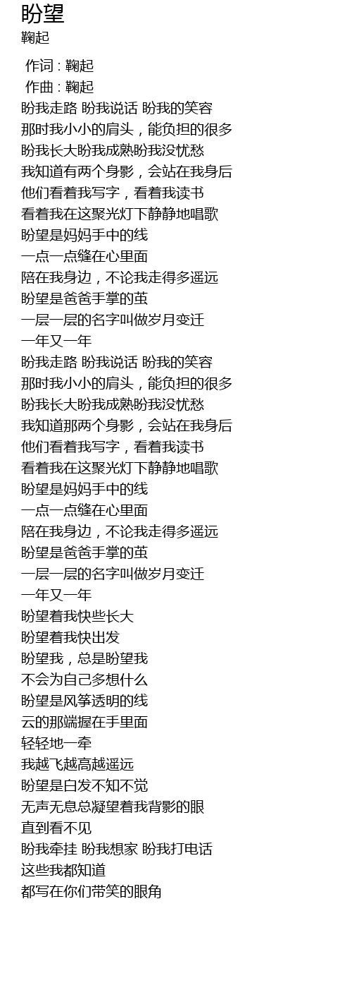 | [03:42.86] | 盼我牵挂 盼我想家 盼我打电话 |