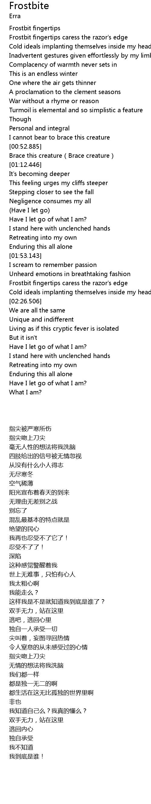| [00:13.417] | Frostbit fingertips caress the razor' s edge |