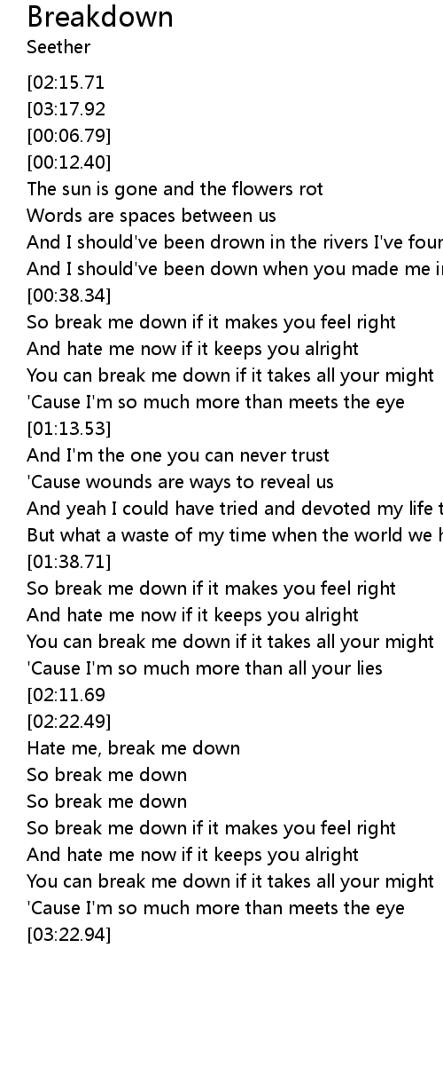 | [03:19.19][02:15.71][01:09.60][00:00.00] | Seether Breakdown |