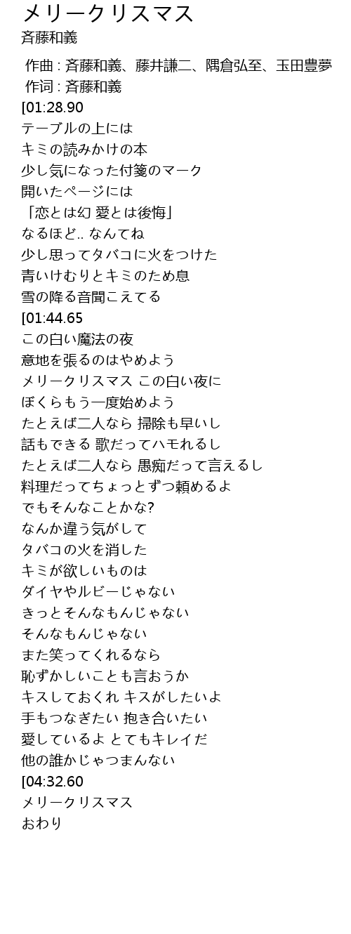| [01:29.55][01:44.65][01:59.45][02:14.08][03:27.48][03:42.34][04:53.65] | メリークリスマス |
