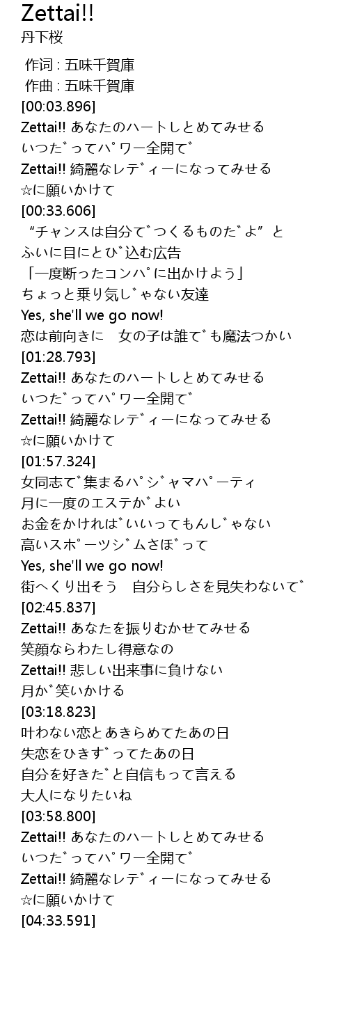 | [00:04.778] | Zettai!! あなたのハートしとめてみせる |