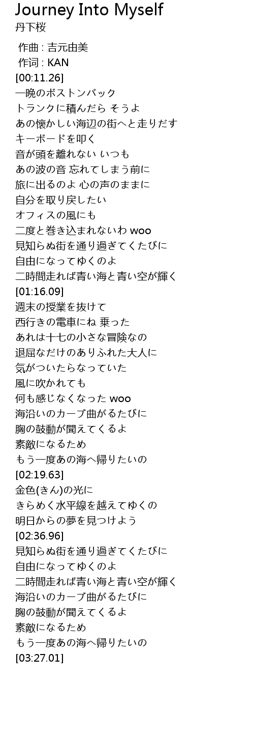 | [00:43.95] | 旅に出るのよ 心の声のままに |