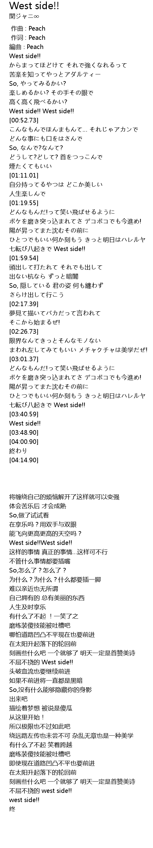 | [03:34.21] | qī zhuǎn bā qǐ West side!! |
