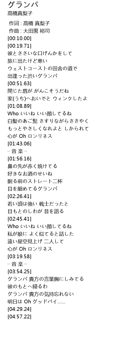 | [03:54.65] | グランパ 貴方の言葉胸にしみてる |