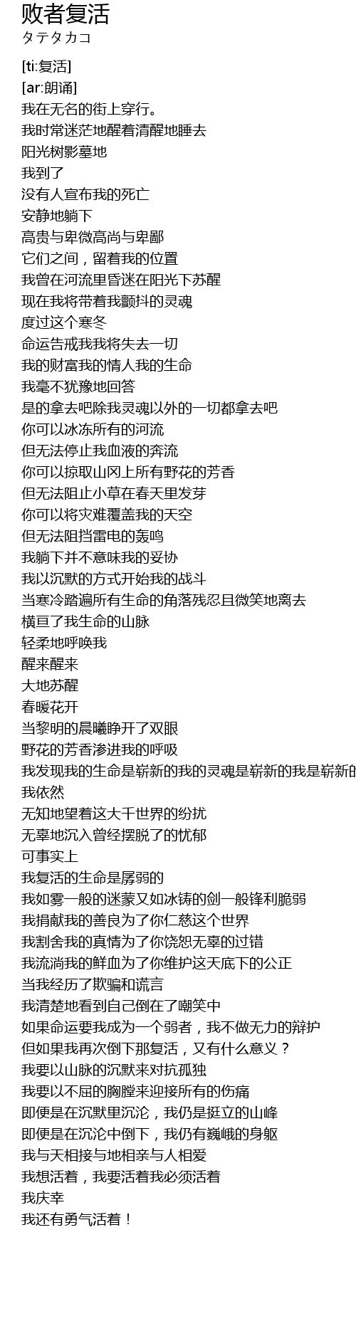 | [04:41.710] | 我想活着,我要活着我必须活着 |
