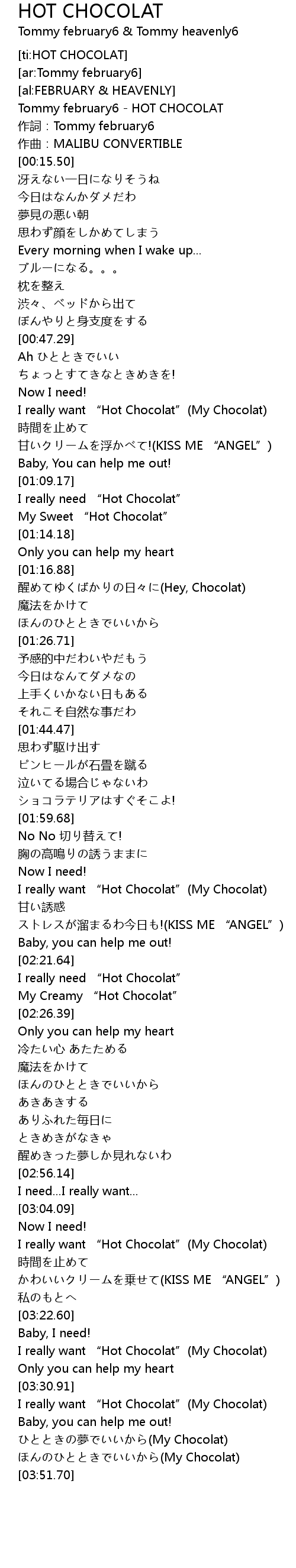 | [00:00.00] | Tommy february6 HOT CHOCOLAT |