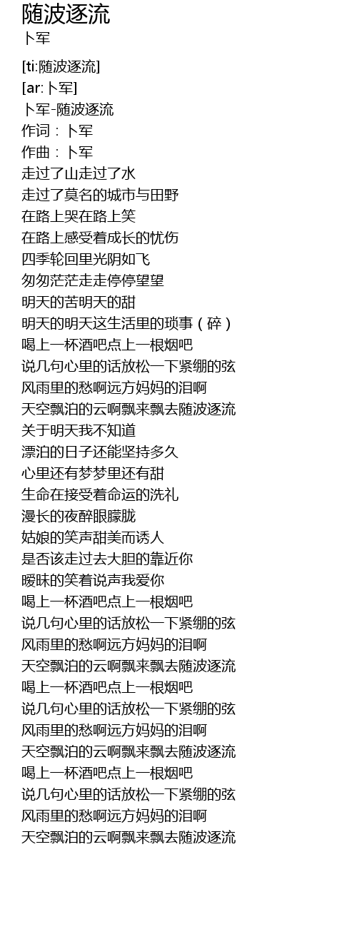 | [02:53.274] | 天空飘泊的云啊飘来飘去随波逐流 |