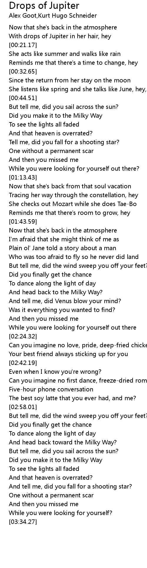 | [00:15.55] | With drops of Jupiter in her hair, hey |
