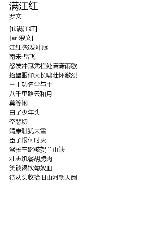 | [00:06.783] | 怒发冲冠凭栏处潇潇雨歇 |