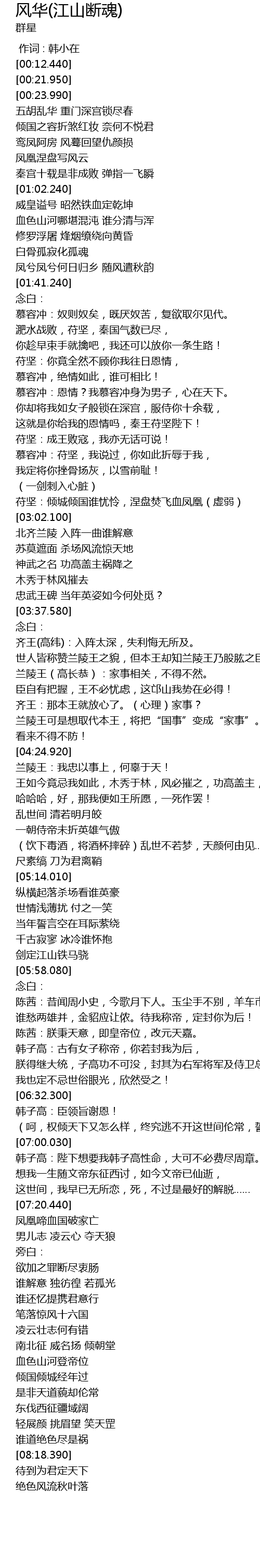 | [05:01.500] | (饮下毒酒,将酒杯摔碎)乱世不若梦,天颜何由见…… |