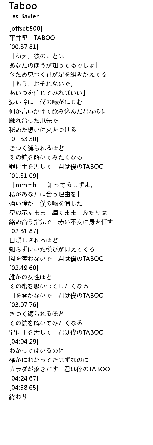 | [03:55.67] | 罪に手を汚して 君は僕のTABOO |