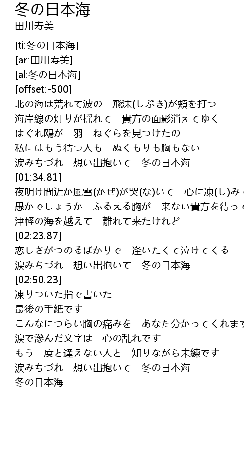 | [02:35.82] | 涙みちづれ 想い出抱いて 冬の日本海 |