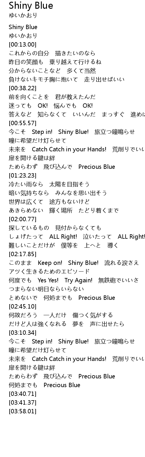| [03:10.69] | 今こそ Step in! Shiny Blue! 旅立つ鐘鳴らせ |