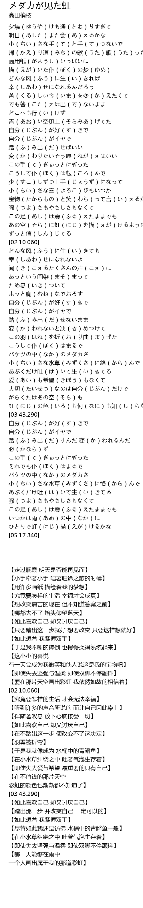 | [04:50.890] | いつかは雨(あめ)の中(なか)に ひとりで虹(にじ)描(えが)けるかな |