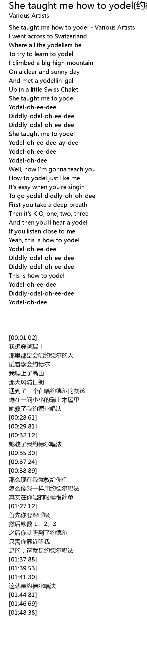 She taught me how to yodel(约德尔调) She taught me how to yodel yue de er diao Lyrics