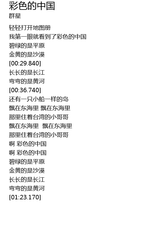 | [00:18.360] | wo di yi yan jiu kan dao le cai se de zhong guo |