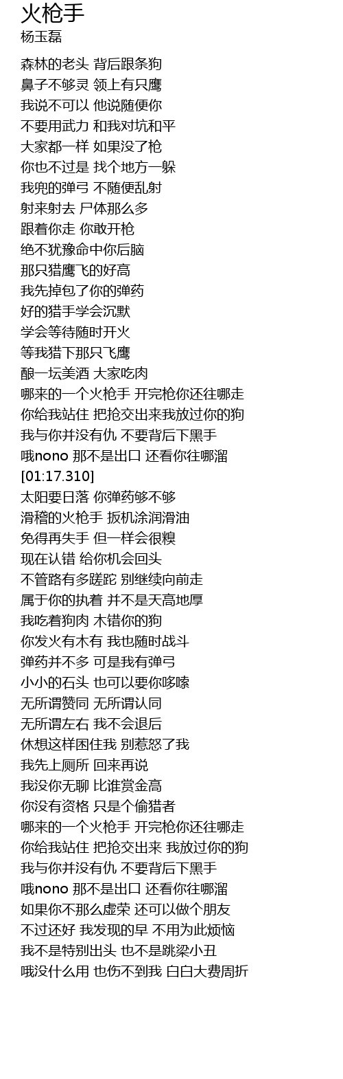 | [00:55.840] | nǎ lái de yí gè huǒ qiāng shǒu kāi wán qiāng nǐ hái wǎng nǎ zǒu |