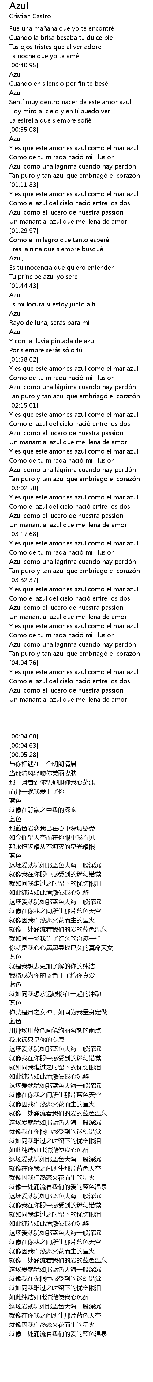 | [04:05.15] | Y es que este amor es azul como el mar azul |