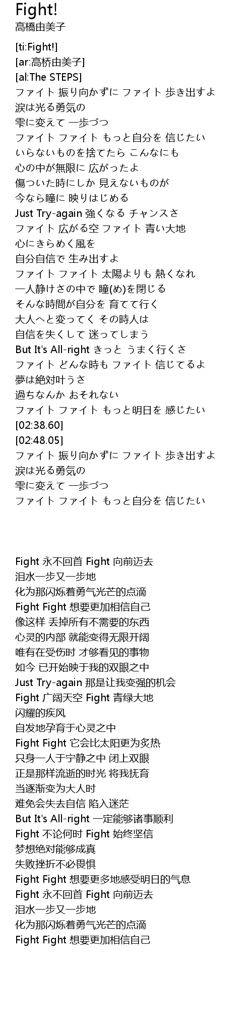 | [00:13.84] | ファイト 振り向かずに ファイト 歩き出すよ |