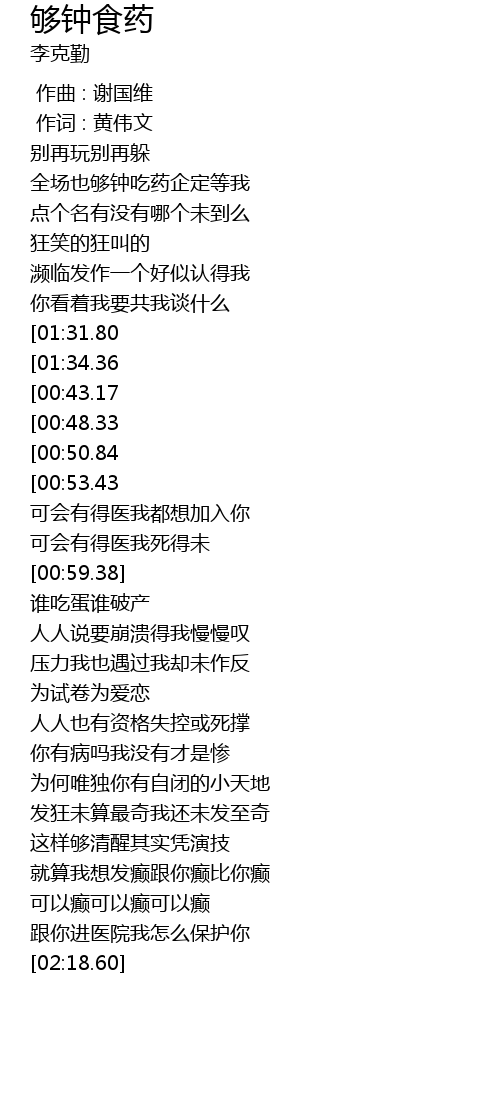 | Song | 够钟食药 |
