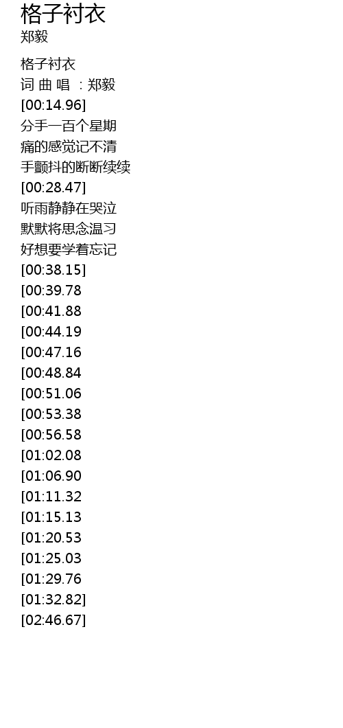 | [02:28.88][01:15.13] | 想着当年你送我的那件格子衬衣 |