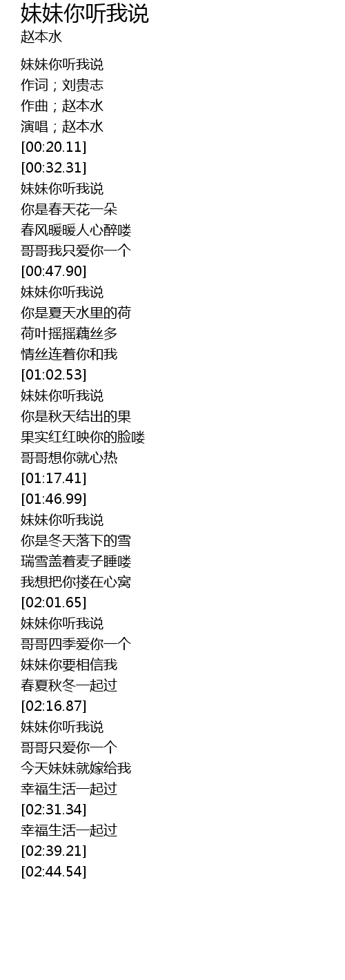 | [01:03.29] | mèi mei nǐ tīng wǒ shuō |