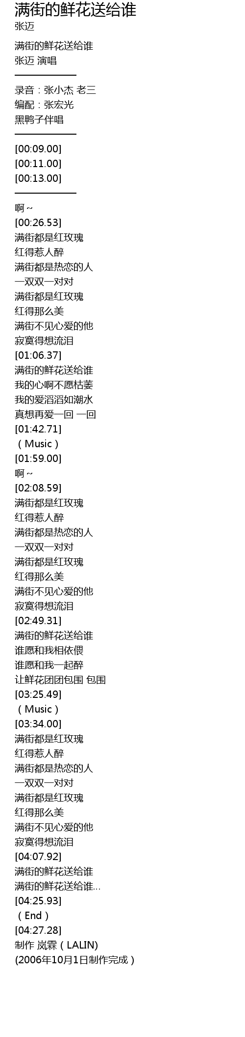 | [04:09.34] | 满街的鲜花送给谁 |