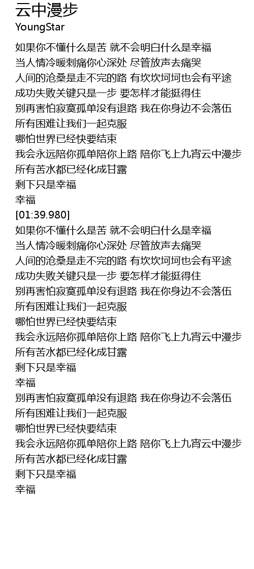 | [03:57.740] | 我会永远陪你孤单陪你上路 陪你飞上九宵云中漫步 |