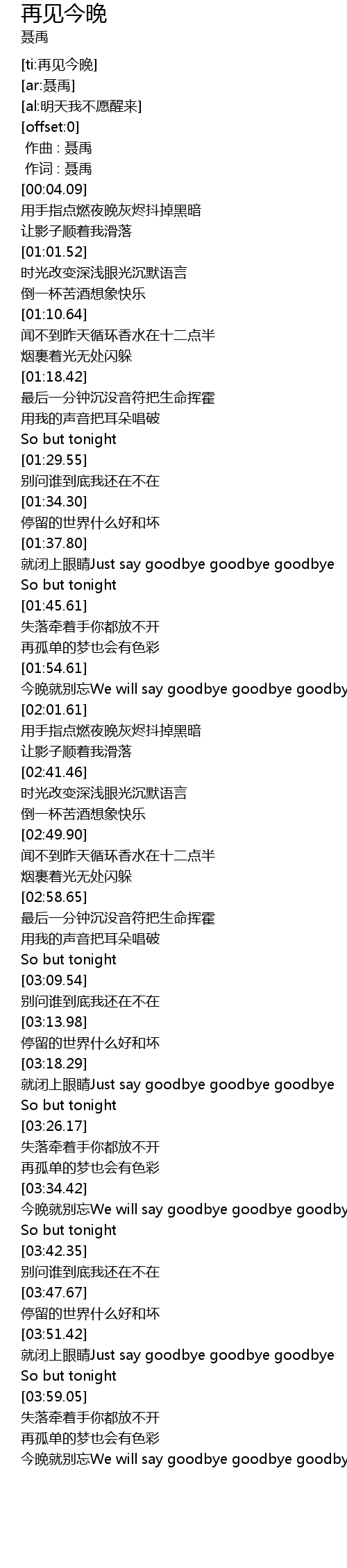 | [04:08.80] | 今晚就别忘We will say goodbye goodbye goodbye |