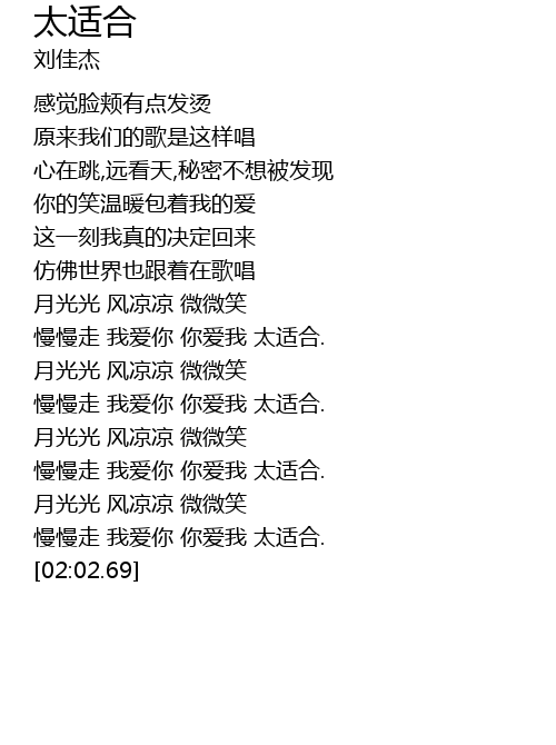 | [00:55.10] | 慢慢走 我爱你 你爱我 太适合. |