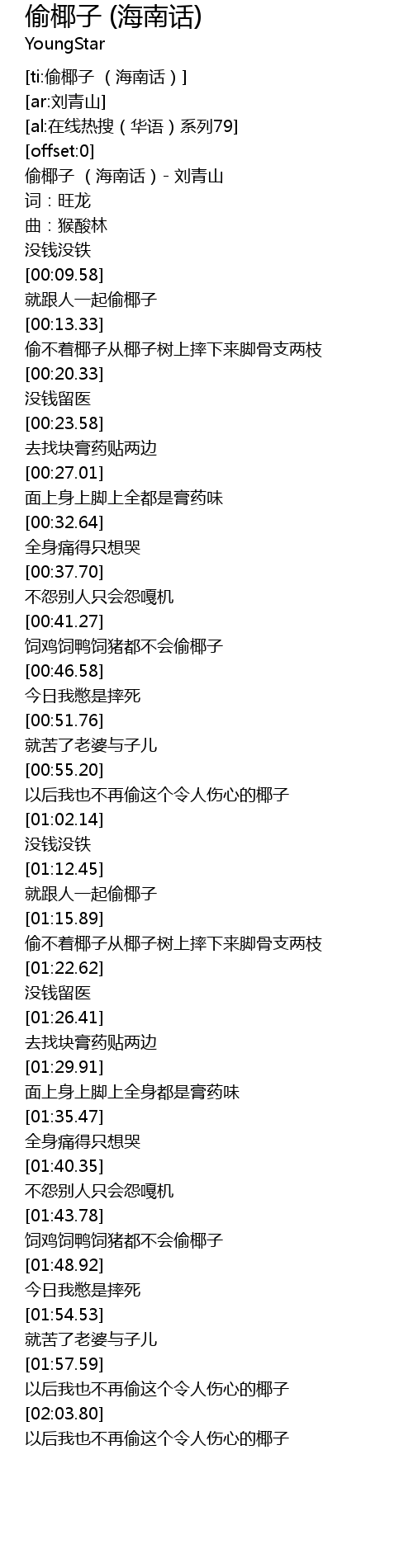 | [00:01.14] | 偷椰子 (海南话)- 刘青山 |
