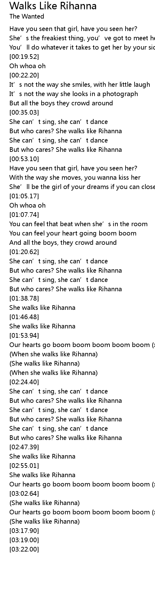 | [01:35.23] | But who cares? She walks like Rihanna |