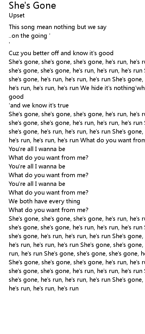 She's gone, she's gone, she's gone, he's run, he's run, he's run She's gone, she's gone, she's gone, he's run, he's run, he's run She's gone, she's gone, she's gone, he's run, he's run, he's run She's gone, she's gone, she's gone, he's run, he's run, he's run What do you want from me? |