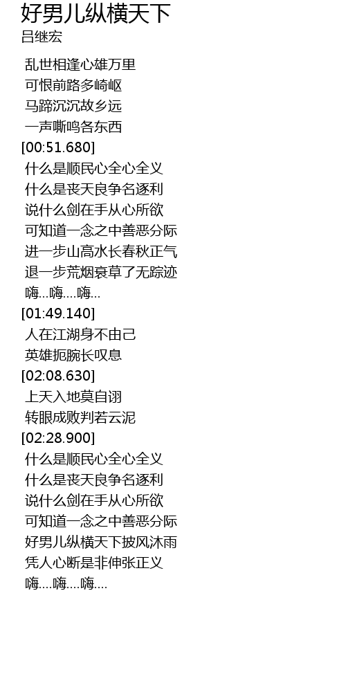 | [03:01.210] | 好男儿纵横天下披风沐雨 |