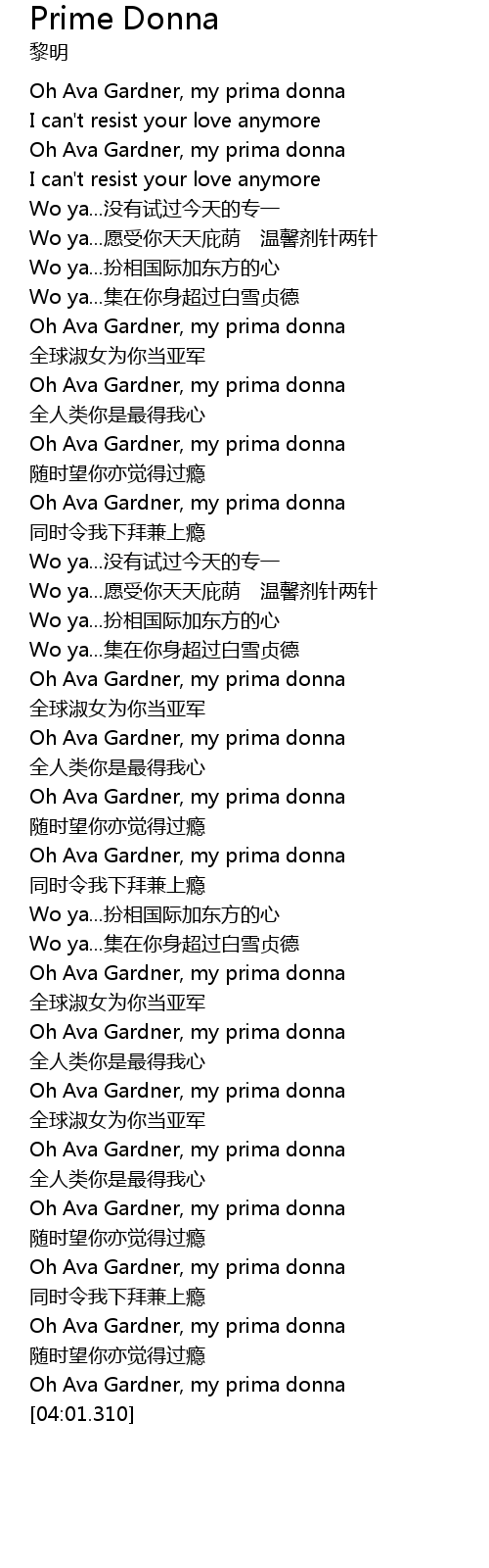 | [01:15.000] | Oh Ava Gardner, my prima donna |