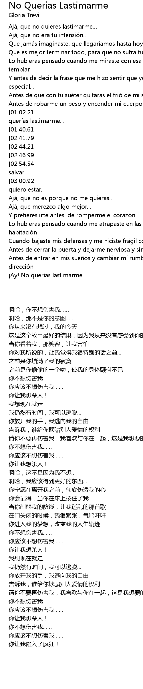 | [00:59.23][01:02.21][01:34.50][01:37.42][02:31.91][02:35.01][03:06.97][03:21.50][03:24.73] | No queri as lastimarme |