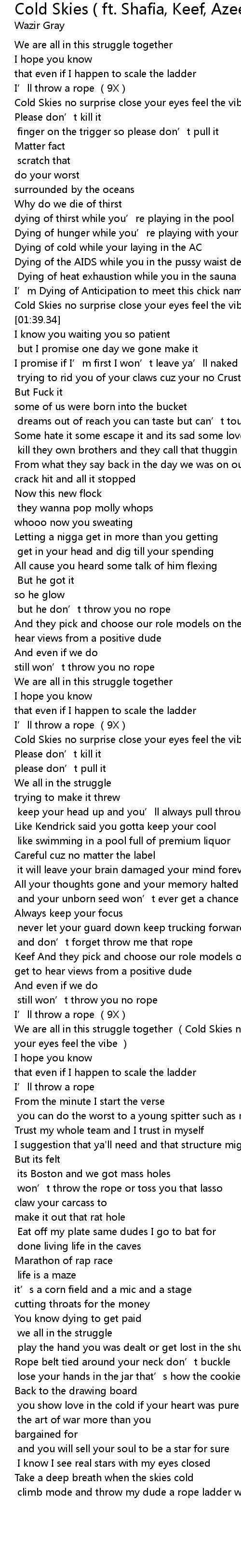 | [03:42.30] | We are all in this struggle together Cold Skies no surprise close your eyes feel the vibe |