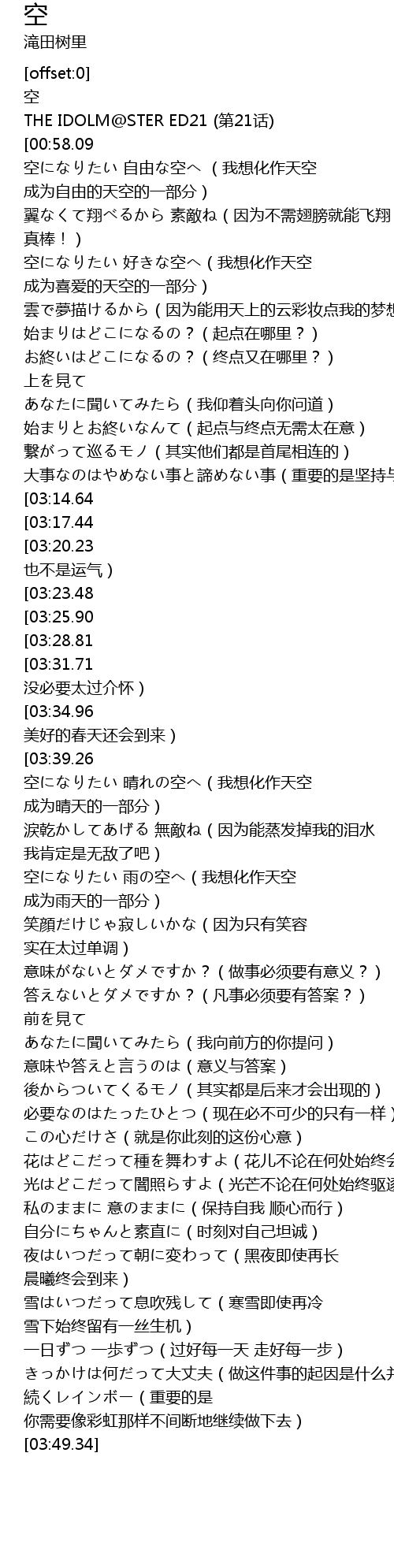 | [00:12.03] | 空になりたい 自由な空へ (我想化作天空 成为自由的天空的一部分) |